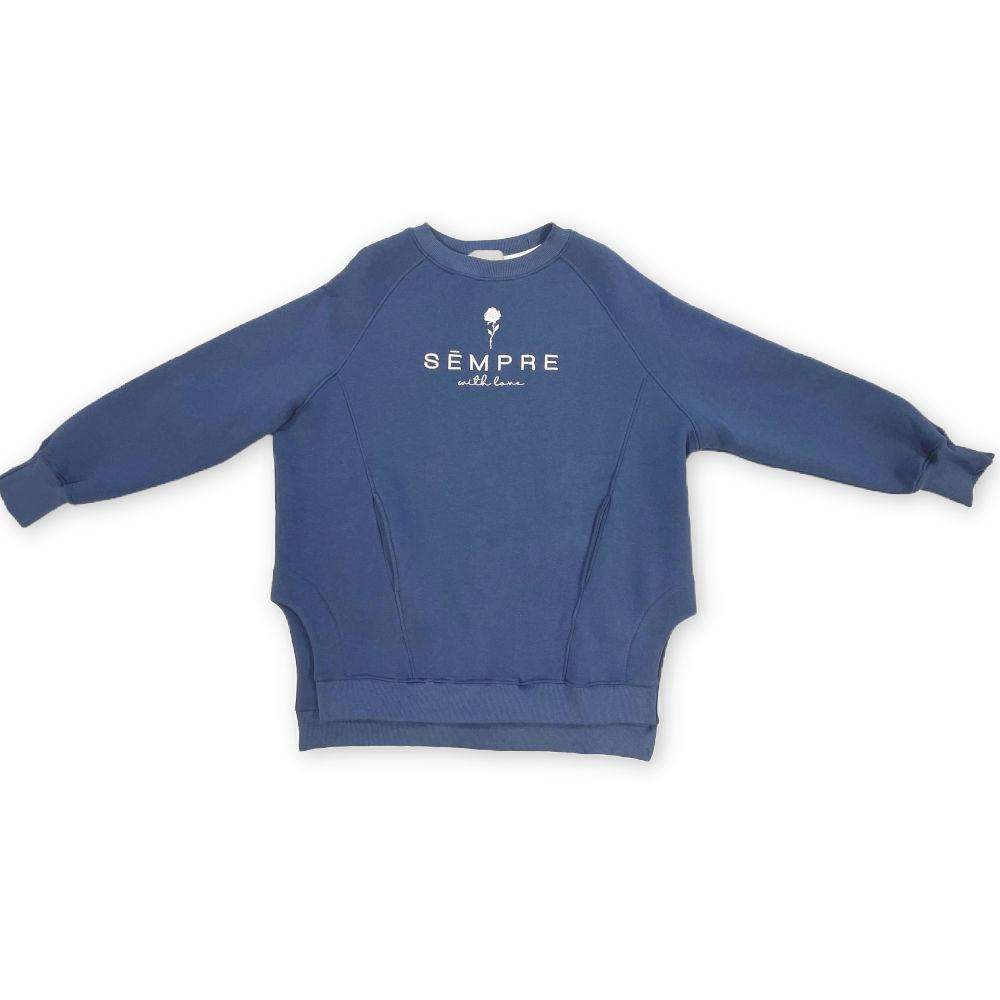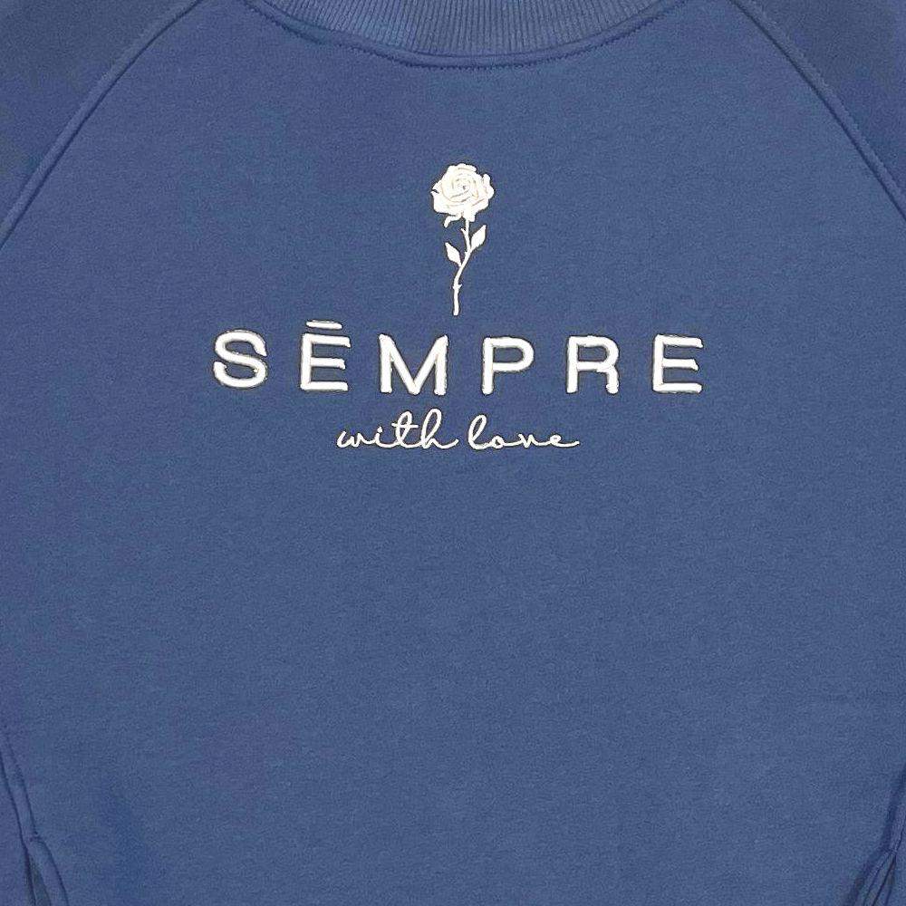 Bluza damska bawełniana SEMPRE ROSIE w kolorze jeansowym. Na przodzie haft z logo i różą. Po bokach rozcięcia. Dwie kieszenie z przodu.