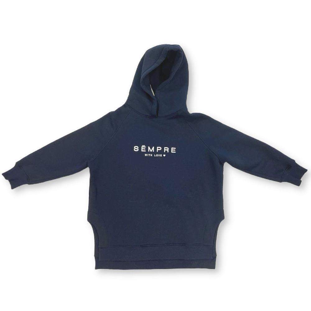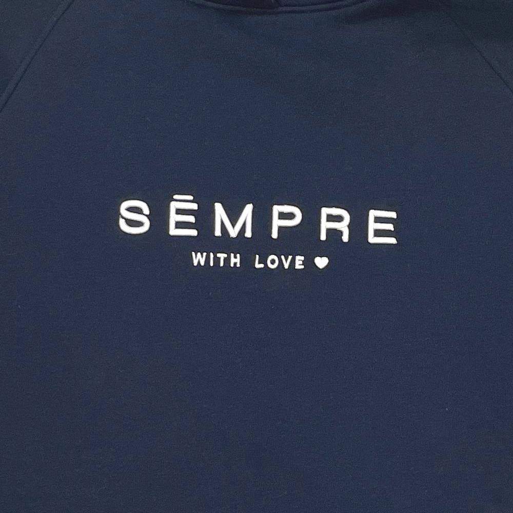 Bluza damska bawełniana Sempre Ruby Granatowa. Z kapturem. Na bokach delikatne zaokrąglone rozcięcia. Na przodzie haft, na rękawie wyhaftowane serduszko.